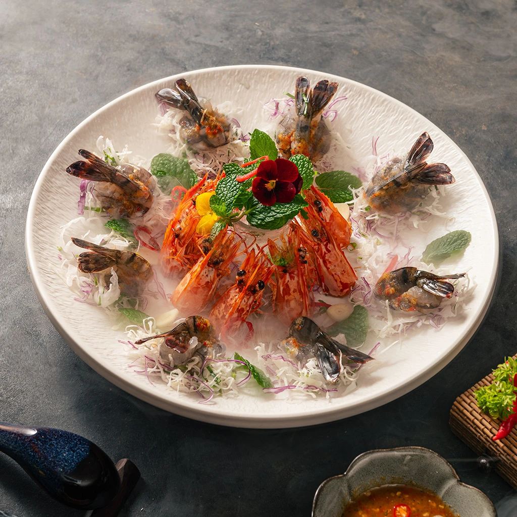 Gỏi Tôm Xốt MANI – tôm tươi ngọt chắc thịt kết hợp đầu tôm chiên giòn, quyện cùng xốt Thái độc quyền chua cay nồng nàn, mang đến món khai vị đầy ấn tượng và cuốn hút.