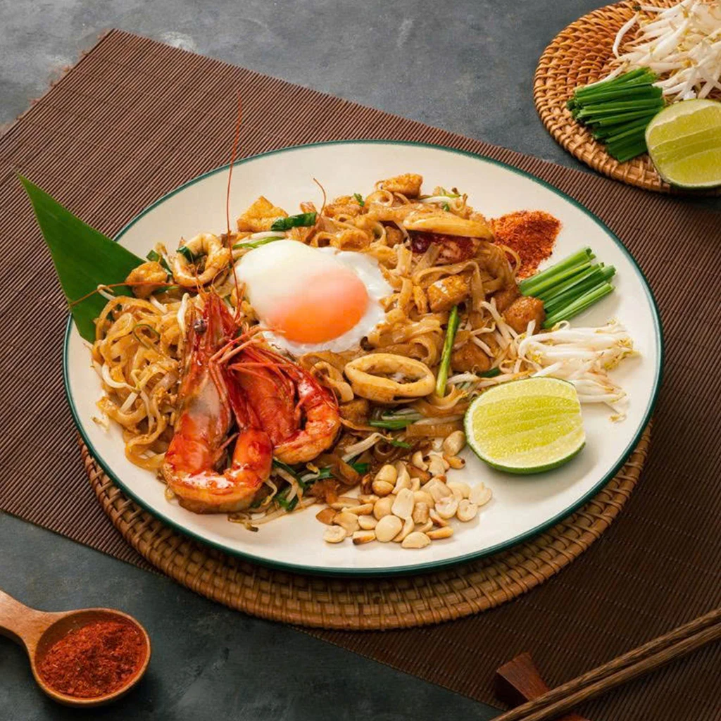 Pad Thái Hải Sản – sự kết hợp hài hòa giữa tôm, mực tươi và mì gạo dai mềm, quyện cùng hương vị chua nhẹ, cay dịu, mặn ngọt cân bằng, mang đậm dấu ấn ẩm thực Thái