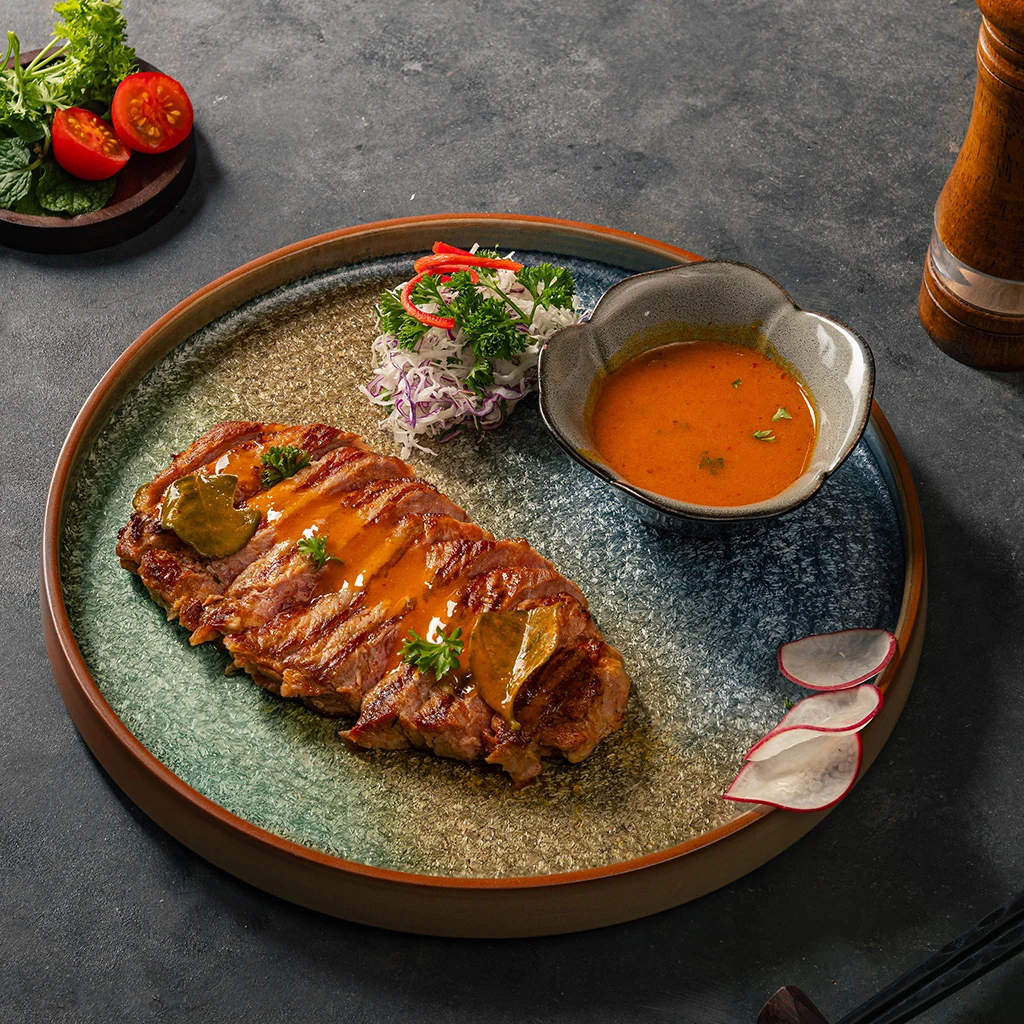 Bò Fuji Áp Chảo Sốt Cà Ri Đỏ – sự hòa quyện giữa thịt bò Fuji thượng hạng và sốt cà ri đỏ đậm đà, béo thơm từ cốt dừa, cay nhẹ và thoảng hương thảo mộc, mang đến hương vị tinh tế chuẩn Thái.