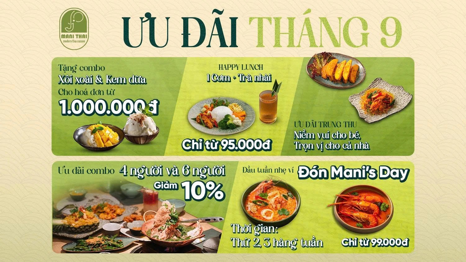 Tháng 9 này, Mani Thai mang đến cho bạn siêu nhiều ưu đãi để mỗi khoảnh khắc trên bàn ăn – từ bữa trưa thường ngày, buổi hẹn rôm rả