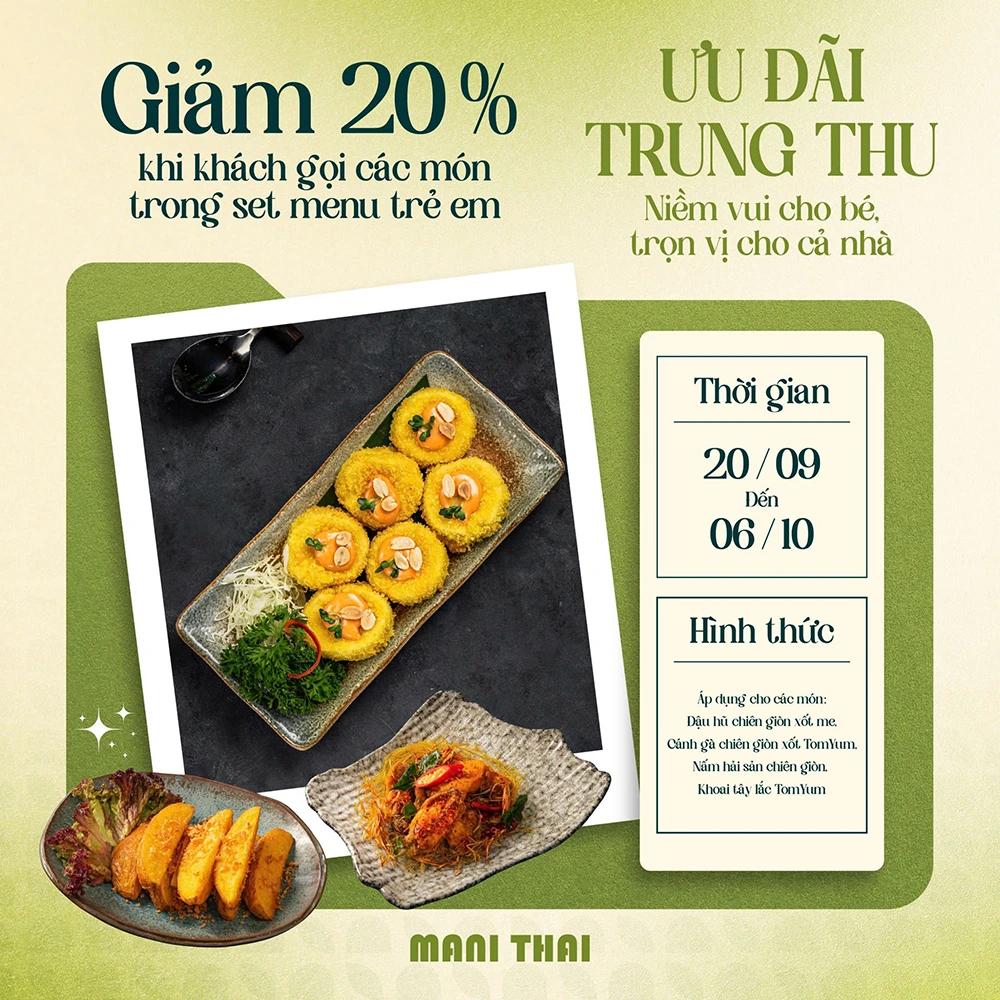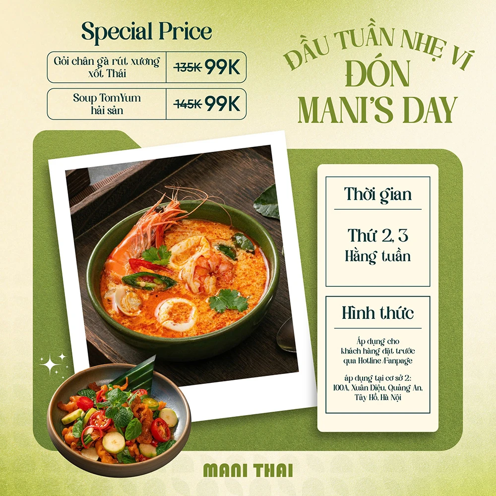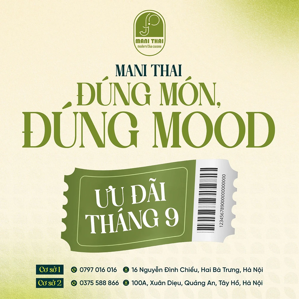 Tháng 9 này, Mani Thai mang đến cho bạn siêu nhiều ưu đãi để mỗi khoảnh khắc trên bàn ăn – từ bữa trưa thường ngày, buổi hẹn rôm rả cuối tuần cho đến những dịp đoàn viên ý nghĩa sẽ không chỉ còn là “đúng món” mà thêm cả “đúng mood”. Hãy lên lịch cùng gia đình và bạn bè thưởng thức vị Thái trong không gian ấm cúng kèm loạt ưu đãi hấp dẫn chỉ có tại Mani: