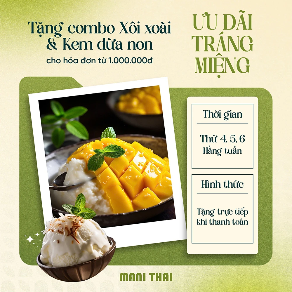 – Hóa đơn từ 1.000.000đ, tặng ngay combo tráng miệng Xôi Xoài & Kem Dừa Non