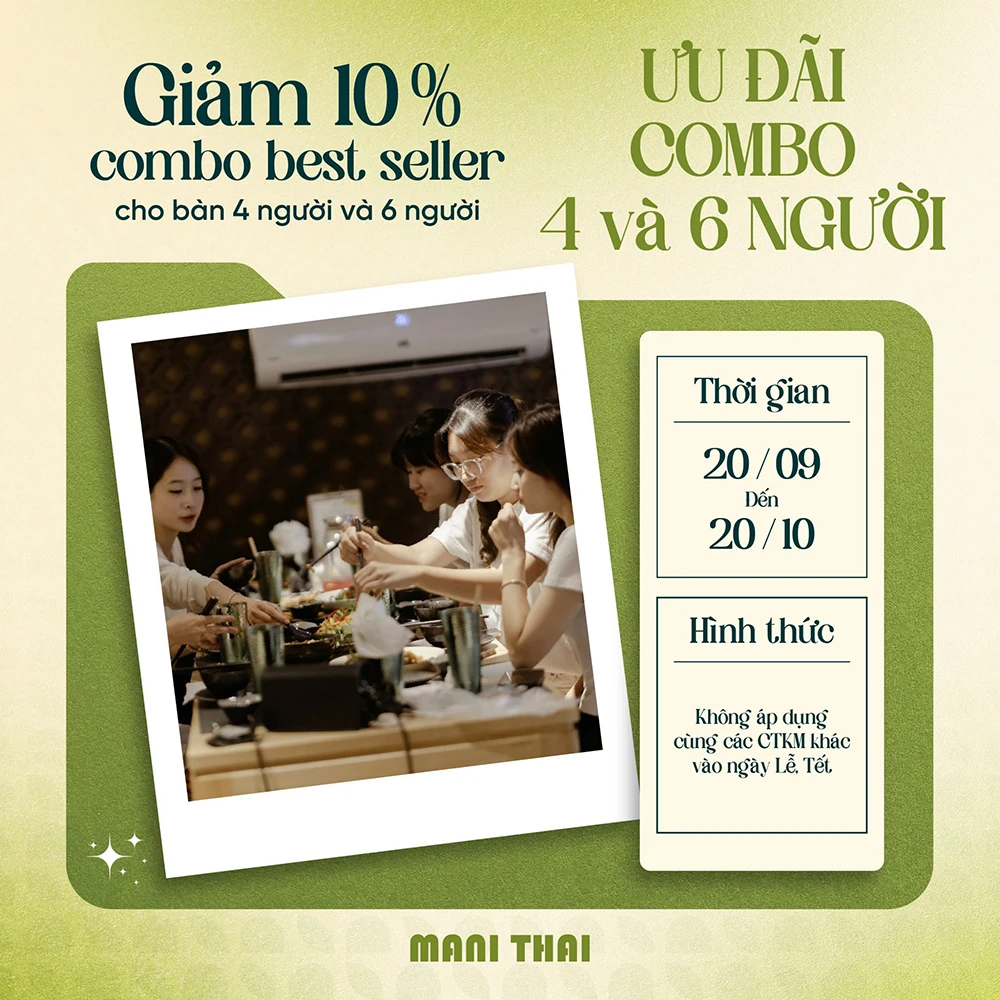 – Giảm 10% combo best seller cho bàn 4 người và 6 người