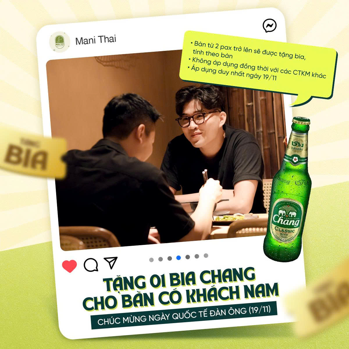 Tặng 01 bia Chang cho bàn có khách nam (áp dụng cho bàn từ 2 pax trở lên)